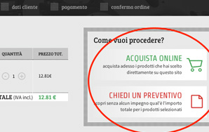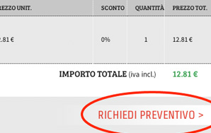 - Procedere alla richiesta di un preventivo. Questa opzione è molto importante perchè innanzitutto non vi impegna economicamente, e in secondo luogo vi da la possibilità di verificare con noi se i prodotti selezionati sono quelli che effettivamente vi occorrono, e se i prezzi sono congrui a quello che cercate.