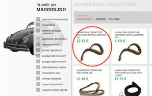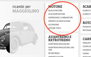 Per visionare le sotto categorie basta cliccare sulle voci in maiuscolo, come ad esempio “Blocco Motore”, “Accessori Motore”, oppure in altre categorie “Avantreno maggiolino”, “Retrotreno”, ecc.